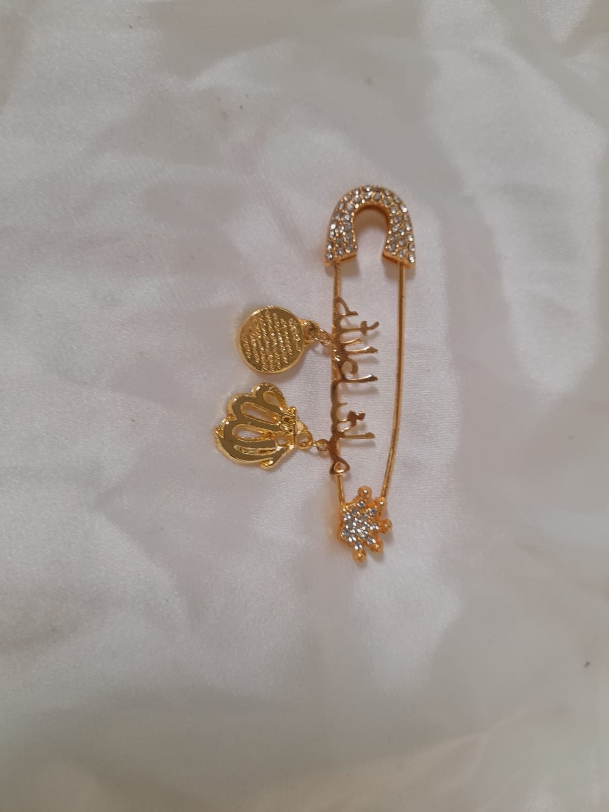 The pin is delicately accented with high-quality zirconia stones, offering a brilliant, diamond-like sparkle. Featuring elegant Islamic calligraphy with Dua-e-Nazar-e-Bad, it is both a spiritual symbol and a stylish accessory.